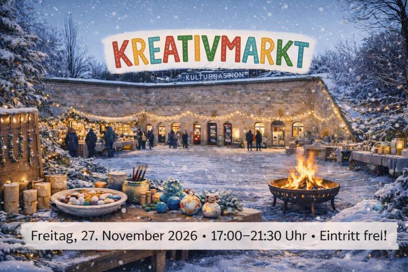 Zum Start in die Vorweihnachtszeit wird die Kulturbastion zum Treffpunkt für kreative Köpfe und alle, die Lust auf besondere Dinge haben. An den Ständen könnte euch eine bunte Mischung aus handgemachten Arbeiten erwarten – vielleicht Keramik, Schmuck, Dekoration, Illustrationen, genähte oder gestrickte Stücke und viele andere kreative Ideen.